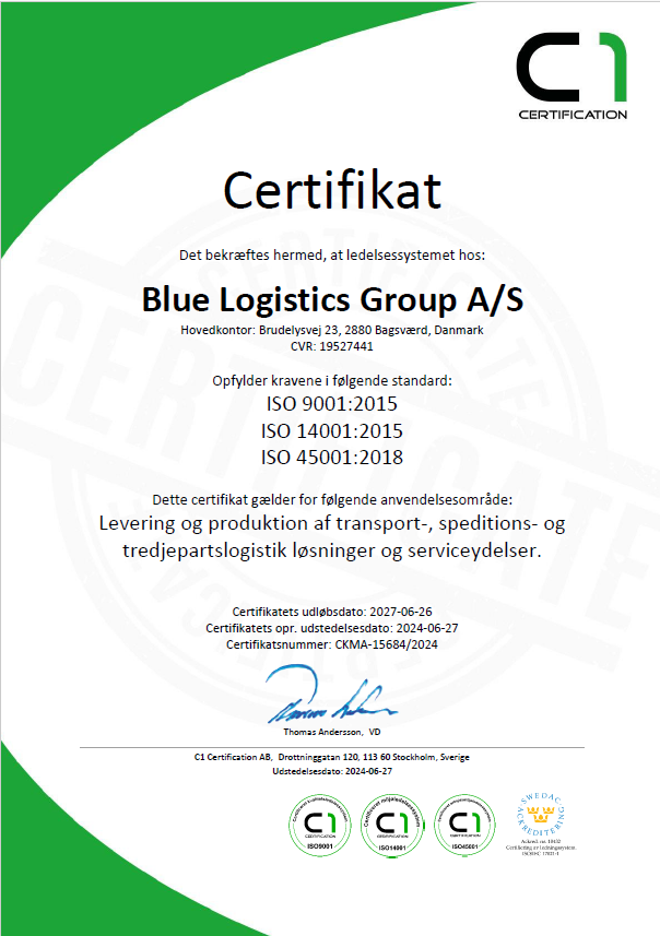 Med ISO 14001-certificeringen demonstrerer vi vores dedikation til miljøet. Vi har implementeret effektive miljøledelsessystemer, der hjælper os med at minimere vores miljøpåvirkning, reducere spild og fremme ansvarlighed i alle aspekter af vores forretning. Vi tror på, at vi alle har et ansvar for at beskytte vores planet, og denne certificering er et skridt i den rigtige retning.